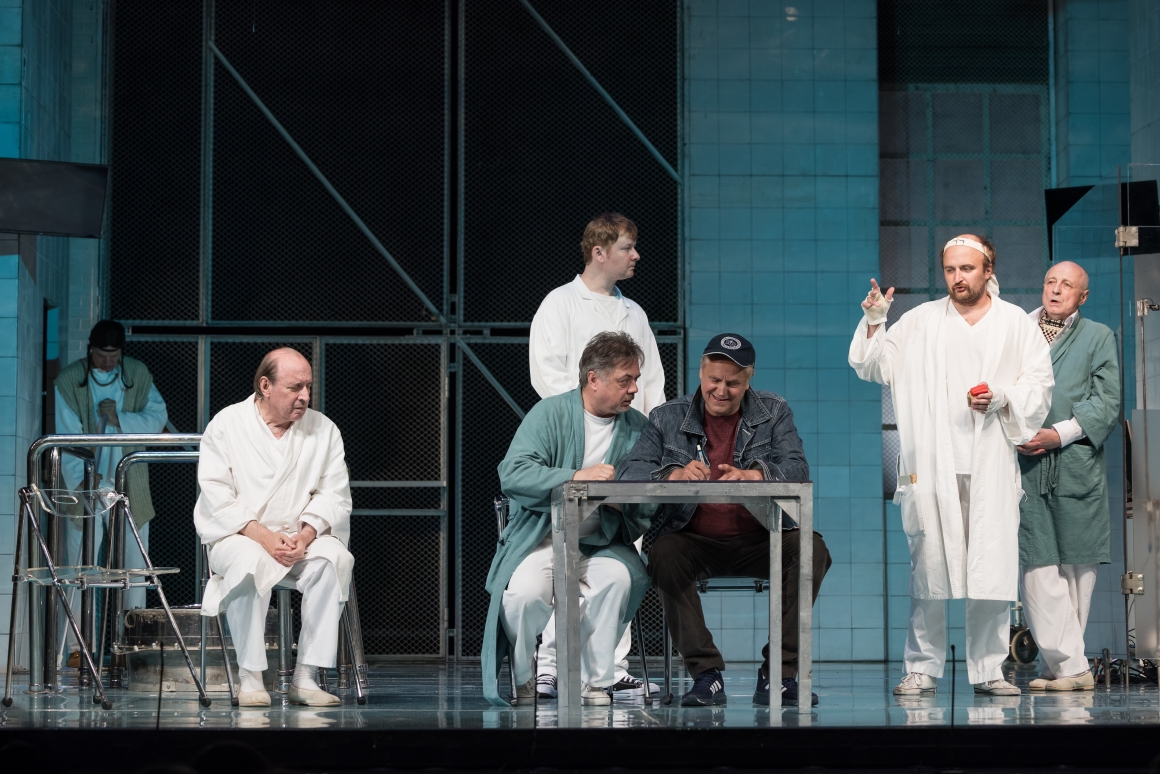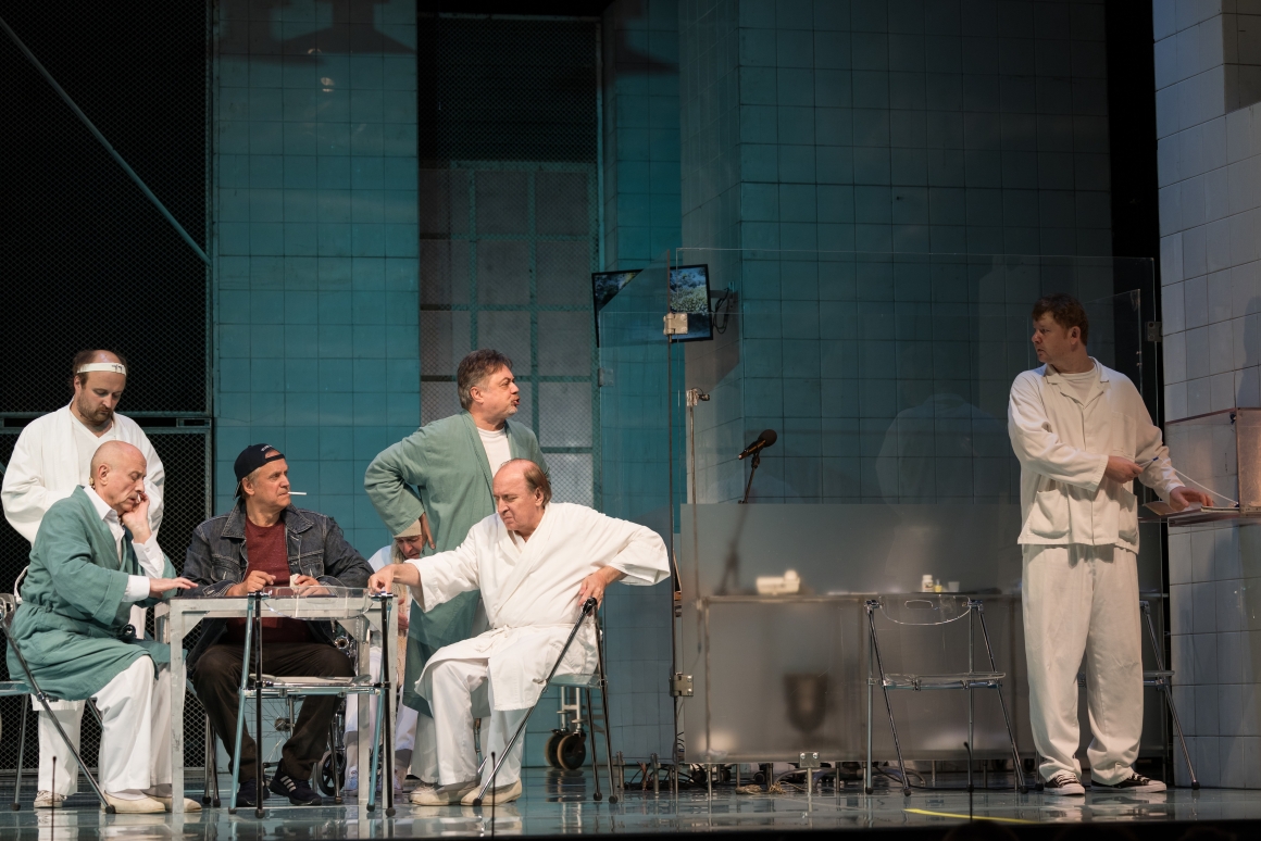 Спектакль полон кинематографических эффектов, а в первые моменты действие даже напоминает трансляцию из психиатрической больницы. Здесь каждый занимается своим делом: медсестра насаждает строгие порядки, больные ездят на каталках или карабкаются по металлической сетке. И вот в этом царстве неоновых ламп и белого кафеля появляется Макмэрфи — бунтарь и революционер. Все действие он будет разрушать устоявшийся порядок, пытаясь расшевелить постояльцев клиники…